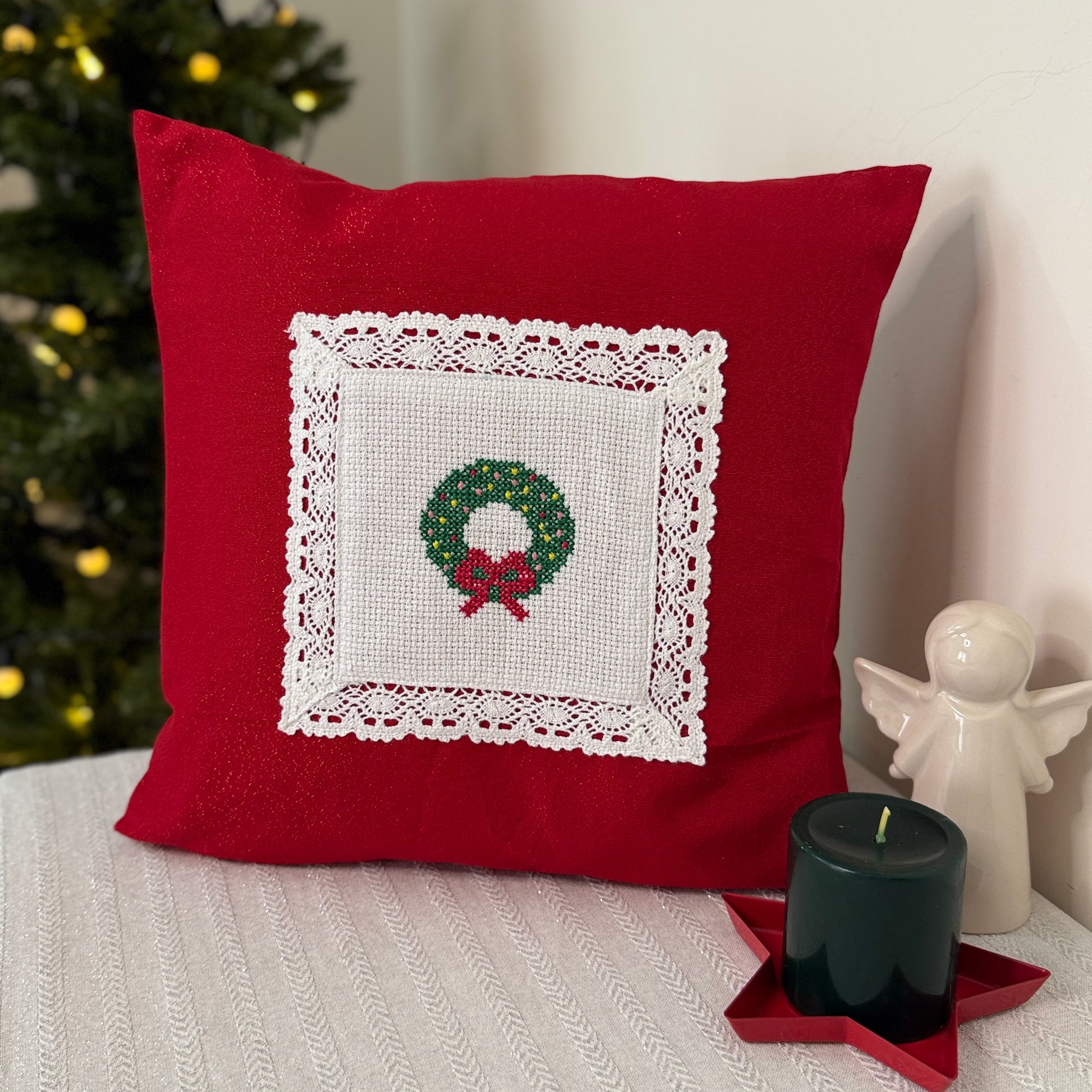 - Description: Handworked. Cross stitched Christmas Wreath & Bow patch on deep Red fabric with Golden lurex weave, placed in the middle of the cushion with crochet lace edging along the patch. Handcrafted with elegance Front and back has the same red fabric.