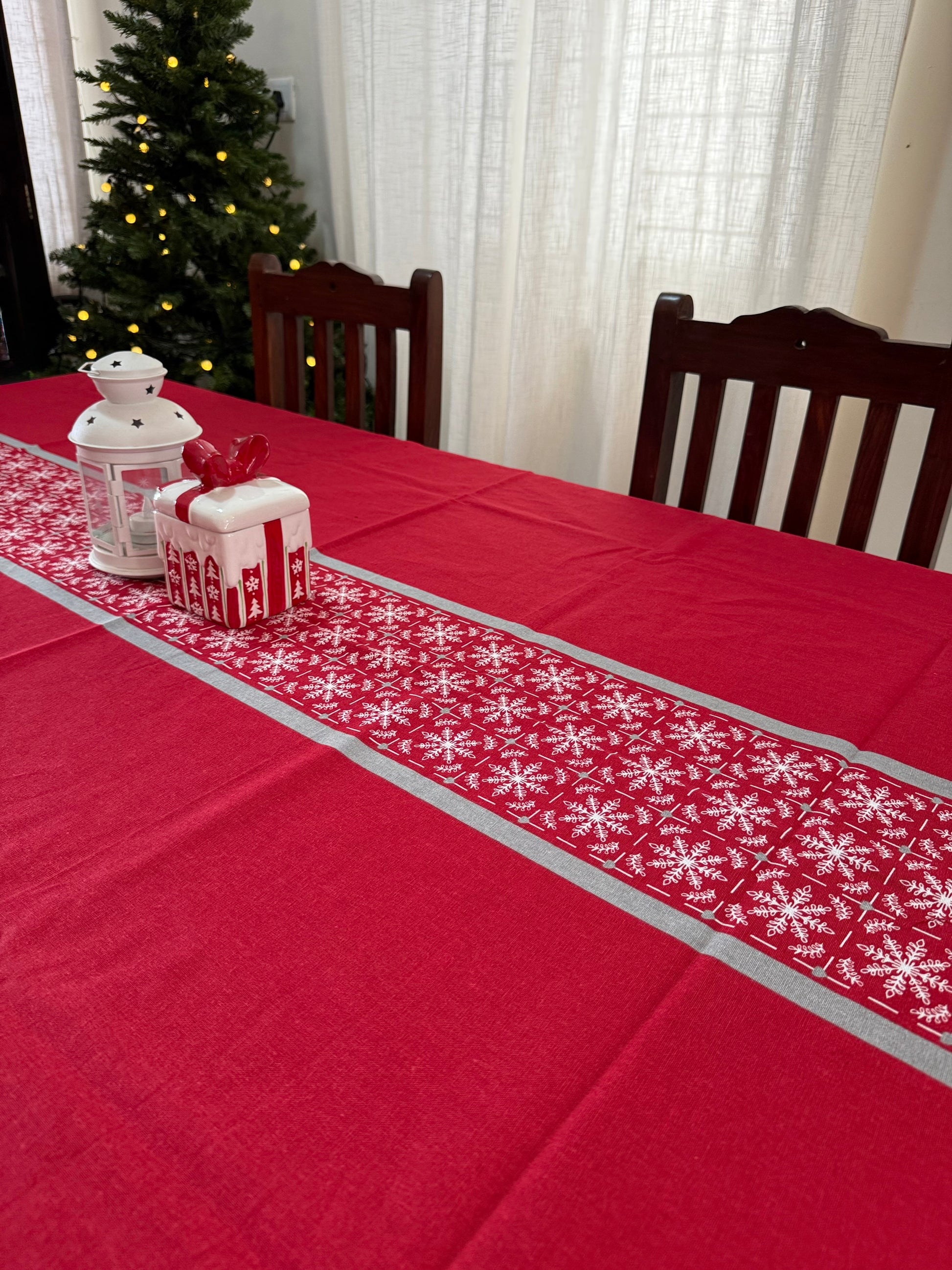 - Description - Simple Christmas themed tablecloth in Cotton with snowflakes print in the middle which resembles a runner.Similar border on length side