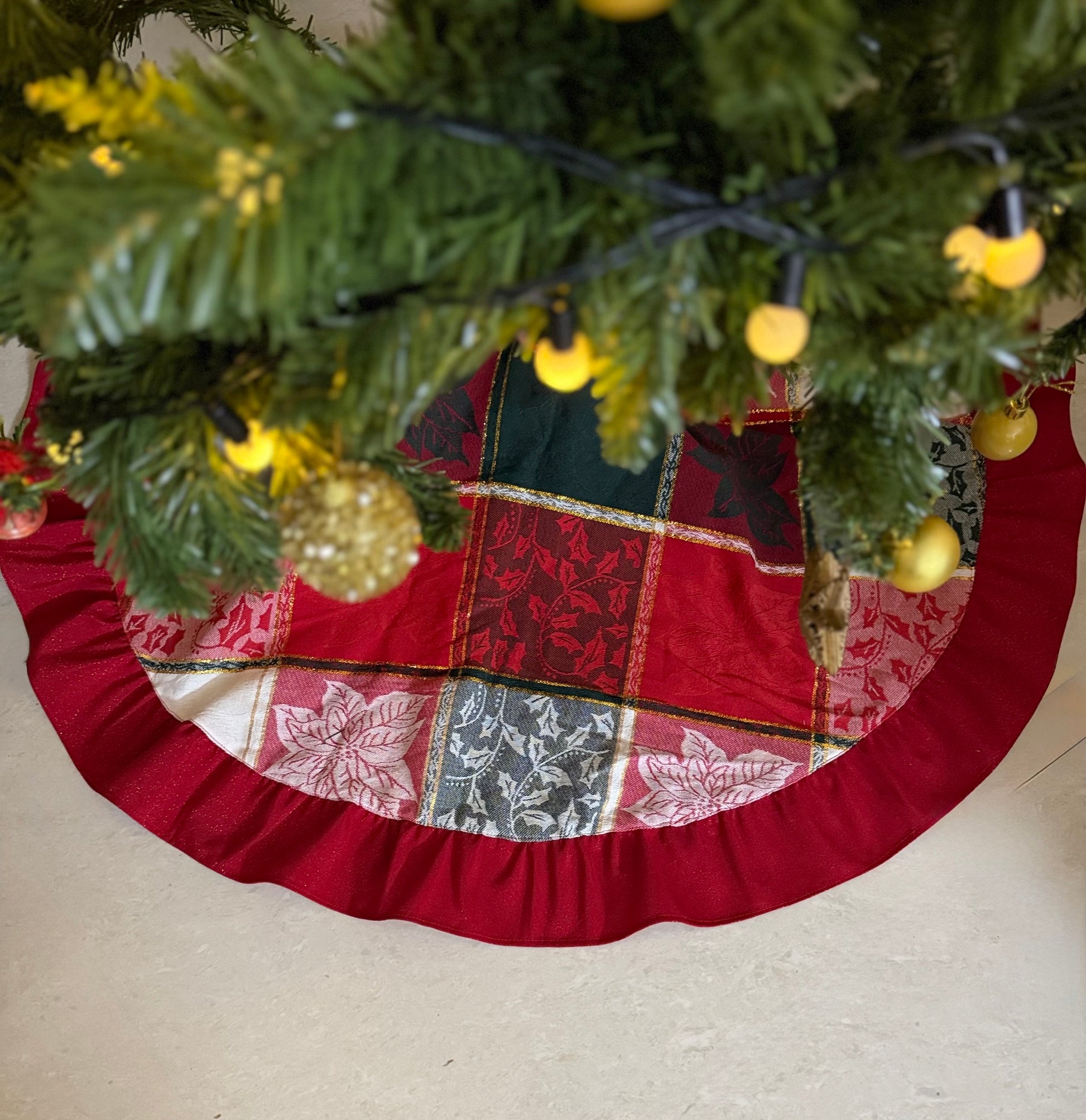 - Description -Tree skirt made in elegant and rich jacquard fabric with beautiful weaves of poinsettias and Holly leaves and golden weaves . Matching shiny lurex Red ruffles along the edge gives it the extra touch of charm and glamour. Easy to maintain and Store .