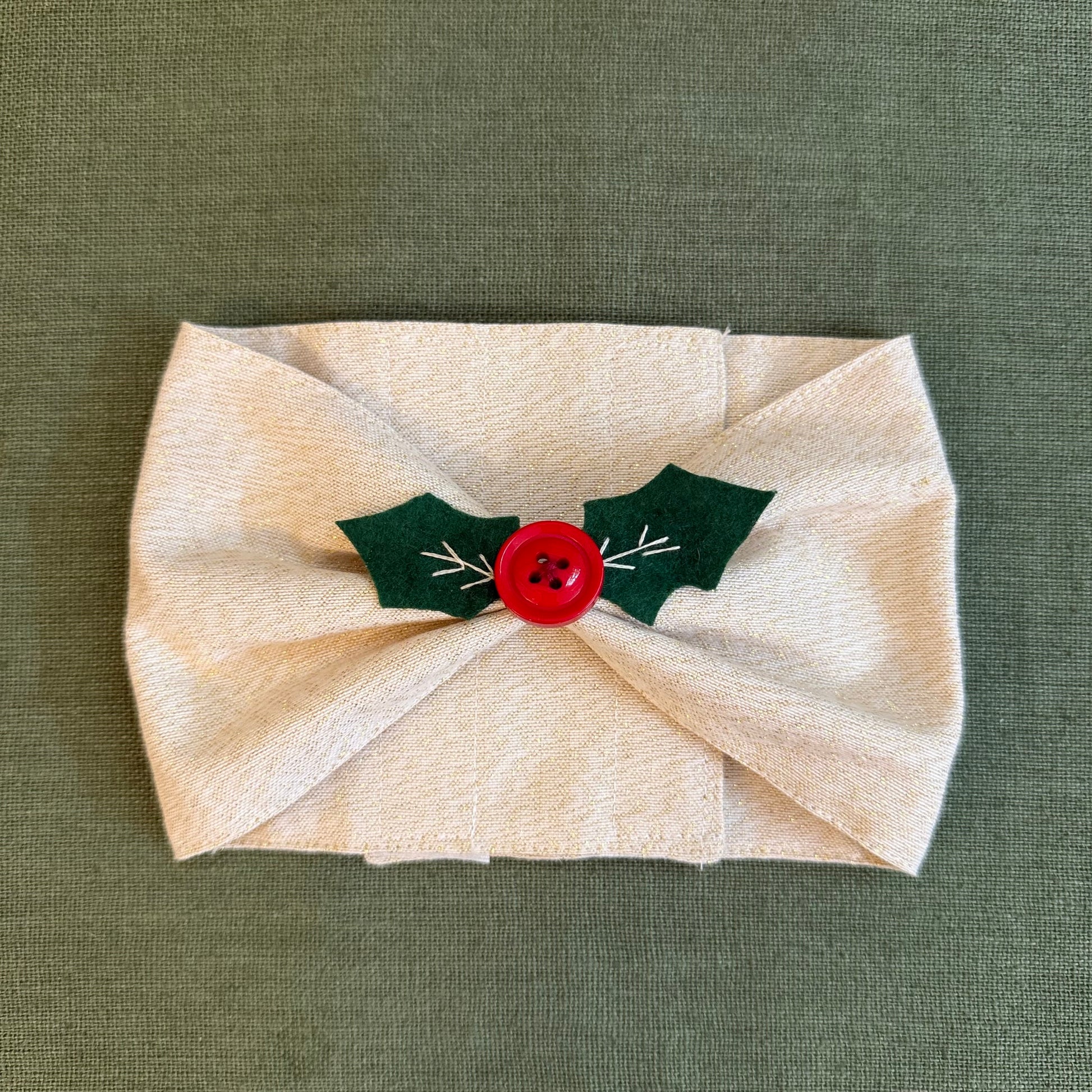 - Description- Curtain Tie backs in Gold and White Lurex , with Red button and Green Felt Holly leaves in the middle making it look like a Bow. . Fastening with Velcro with size adjustable extra band.