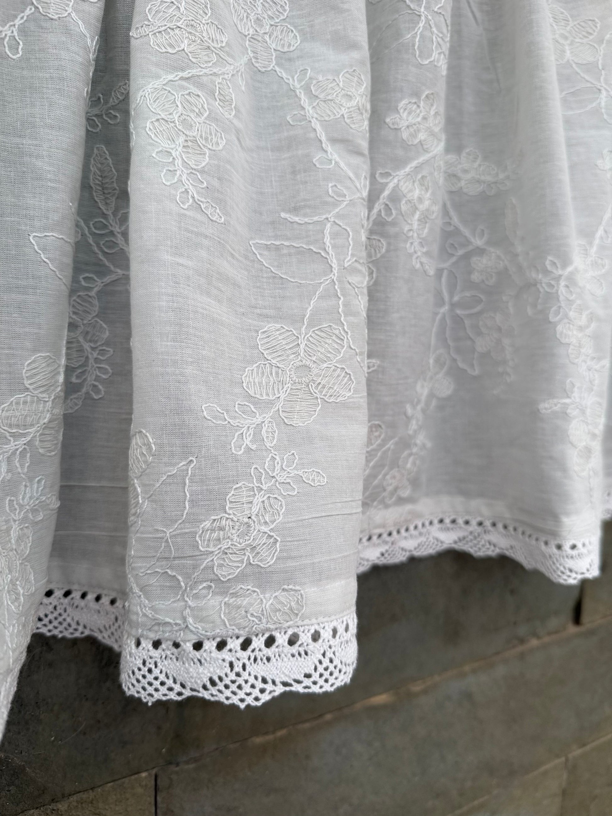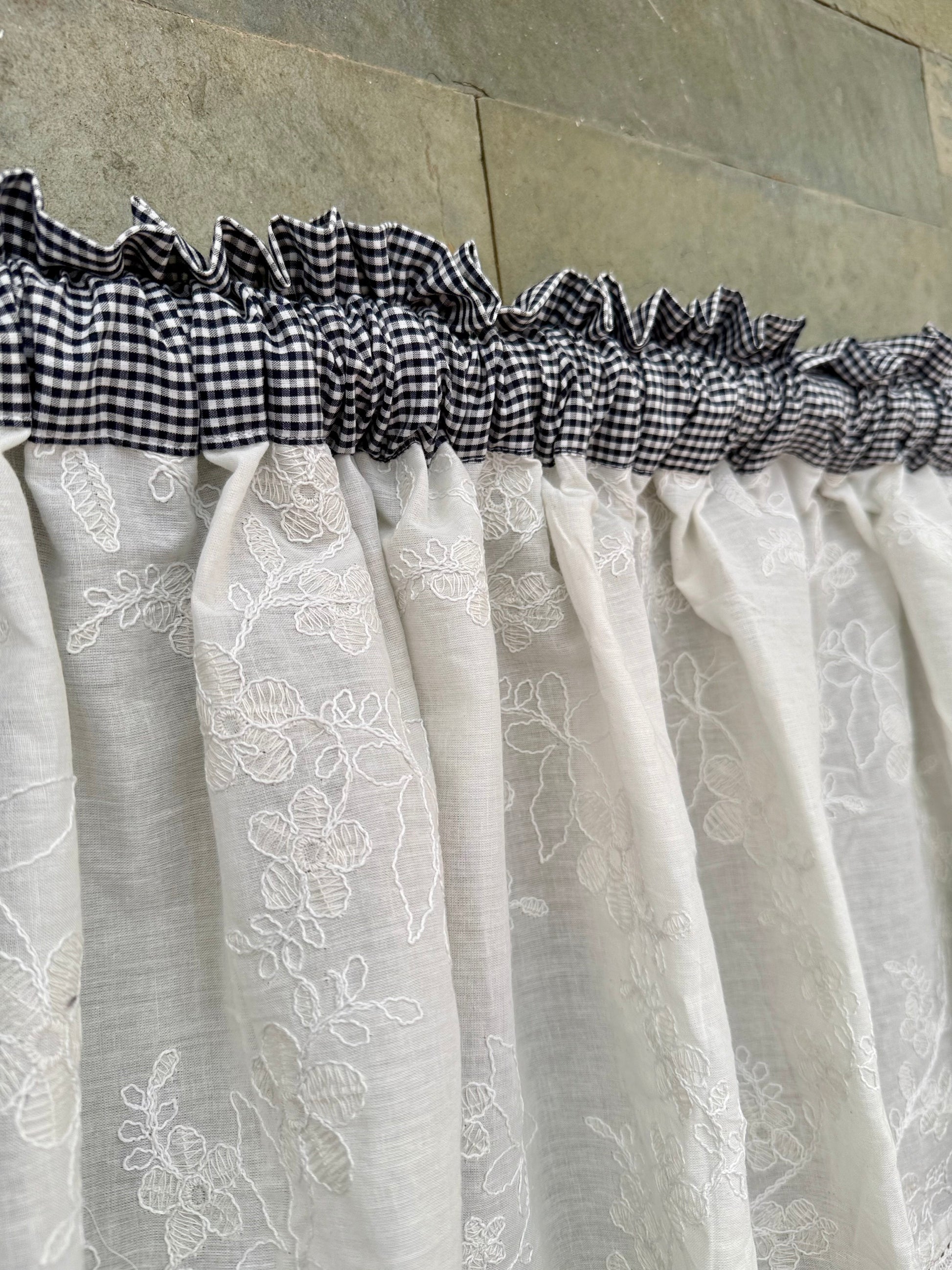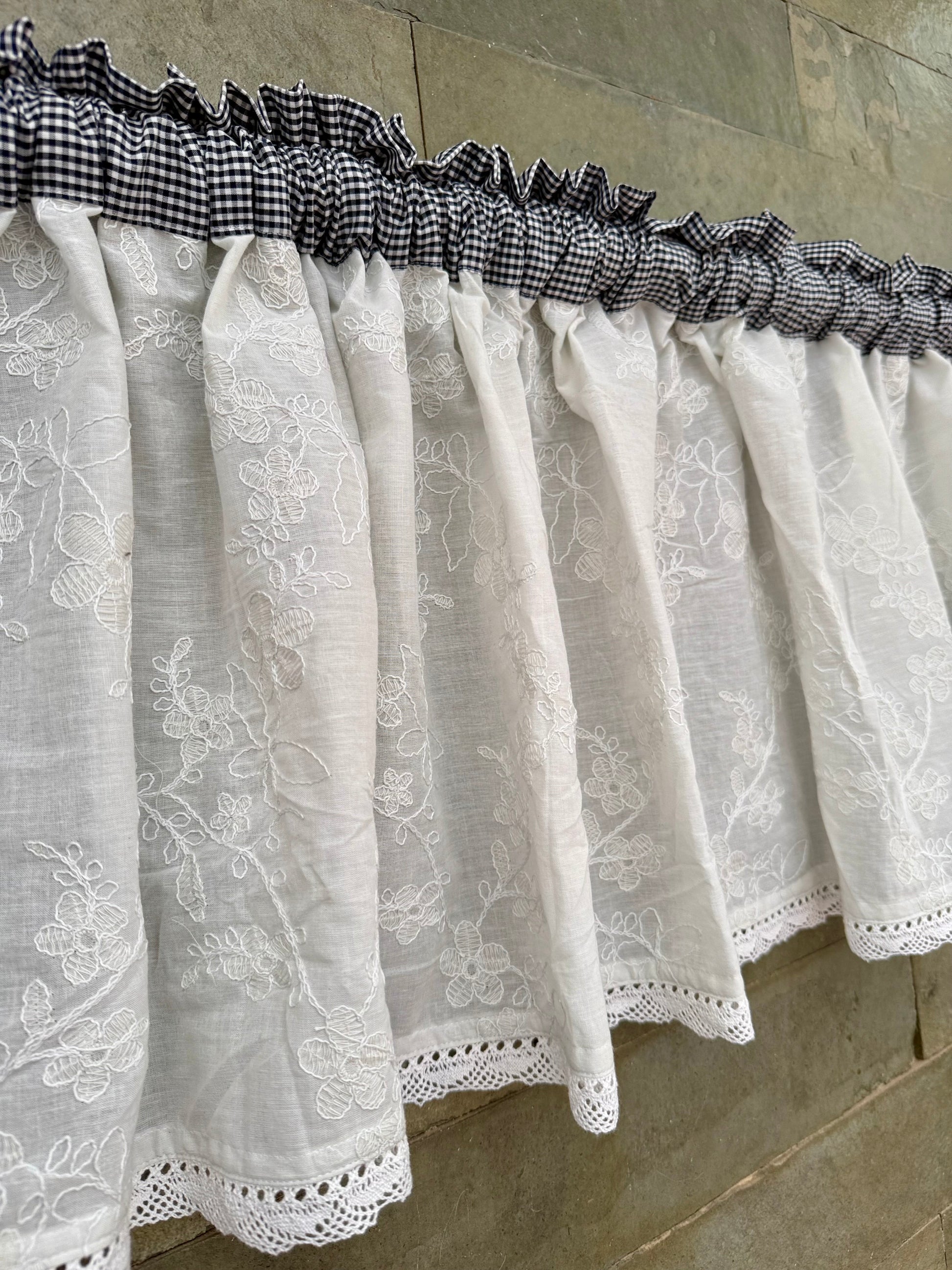 - Description - Kitchen Valance are small curtains used in Kitchen windows. It can also be used as the front panel in Double Curtains in Living Room. This piece has been carefully designed with lace and embroidered sheer cotton detailing.