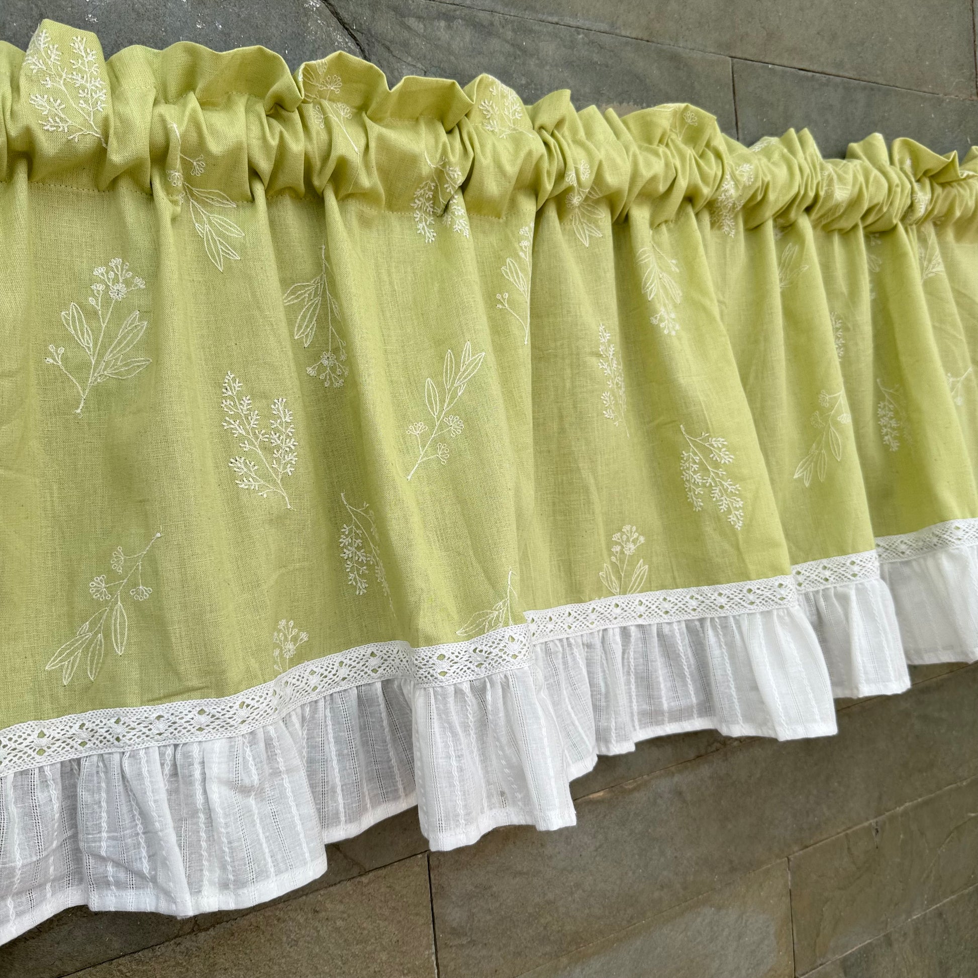 This piece has been carefully designed with Embroidered lemon green Flex cotton fabric with White ruffles and crochet lace along the joint . - Fixture - Can be used for Rod and Spring inserts.