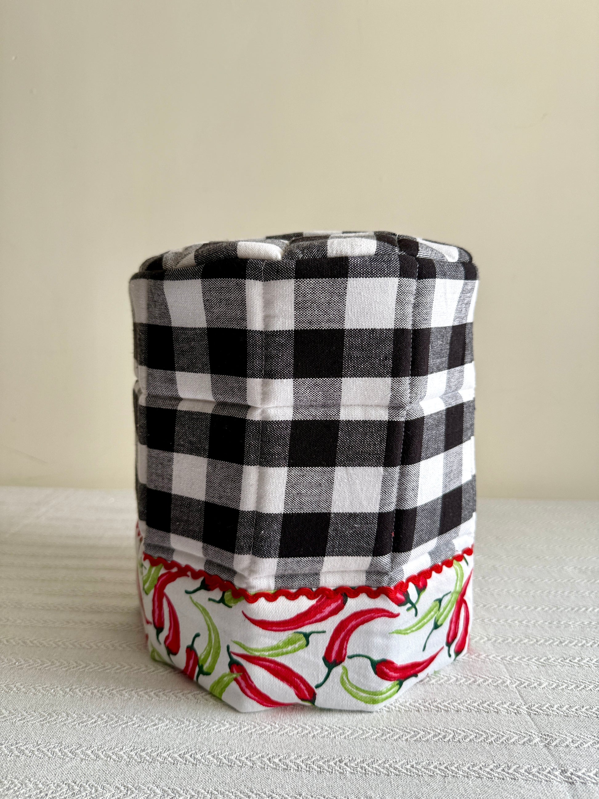 - Description - 3 layered ,Quilted cover for Mixer Grinder/ blenders . It comes with a handle on top , 10mm foam padding and matching lining inside. Chilly print border given at the edge to add elegance and beauty to this product long with red RicRac along the joint. This is a perfect fit for Bosch and Sujata Mixies . Do check the size instructions given before placing the order . It’s made with a little extra margin than the exact diameter to ensure ease of use.