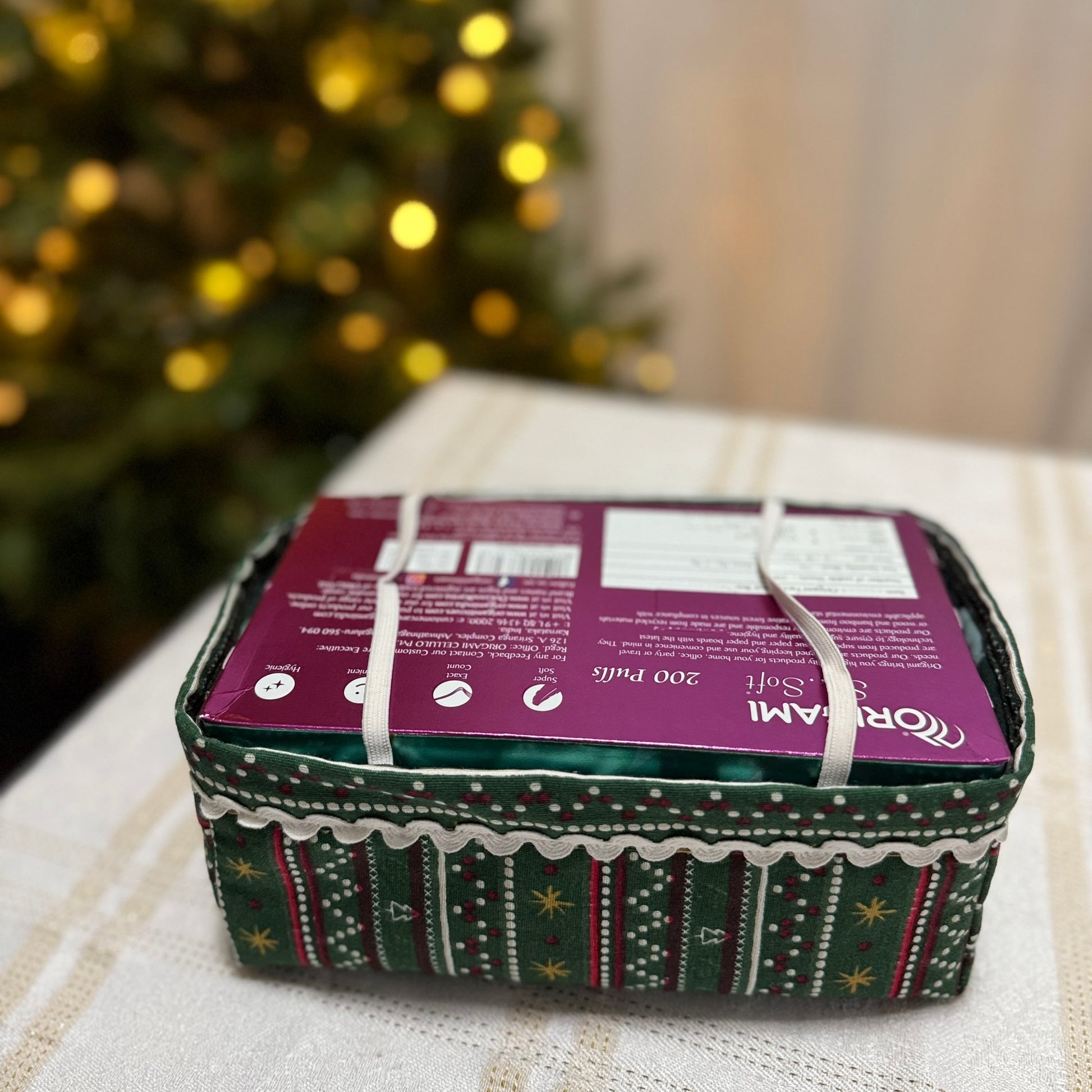 - Description: Box style Cover for Tissue Box with a opening in the middle. Made with foam padding inside , it’s crafted to fit the Tissue box perfectly. Comes with white RIcRac lace along the edges, making it look elegant and grand to be placed on your table/ console/ car etc. Two Elastics attached underneath to hold the box in place
